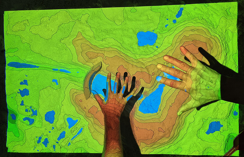 Die Geographie-Didaktik zeigt eine Sandbox, mit der sie Prozesse simulieren kann, welche die Oberfläche der Erde verändern – etwa Flussläufe und die Folgen von Hochwassern. Mit der Box lassen sich verschiedene Talquerschnitte modellieren und der sich daraus ergebende Wasserabfluss und die Erosion messen. Mithilfe einer 3D-Kamera und eines Beamers ist es außerdem möglich, Veränderungen der Höhenlinien in Echtzeit darzustellen.