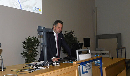 Dipl.-Geogr. Eric Losang vom Leibniz-Institut für Länderkunde, Leipzig und Vorsitzender der Kommission für Atlaskartographie der Deutschen Gesellschaft für Kartographie bei der Vorstellung des Jubiläumsatlas "100 Jahre Geographische Gesellschaft Würzburg 1925–2025". Foto: J. Kempf.